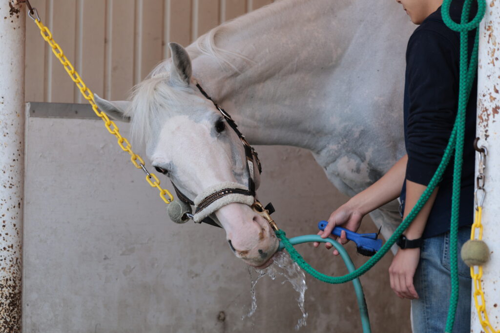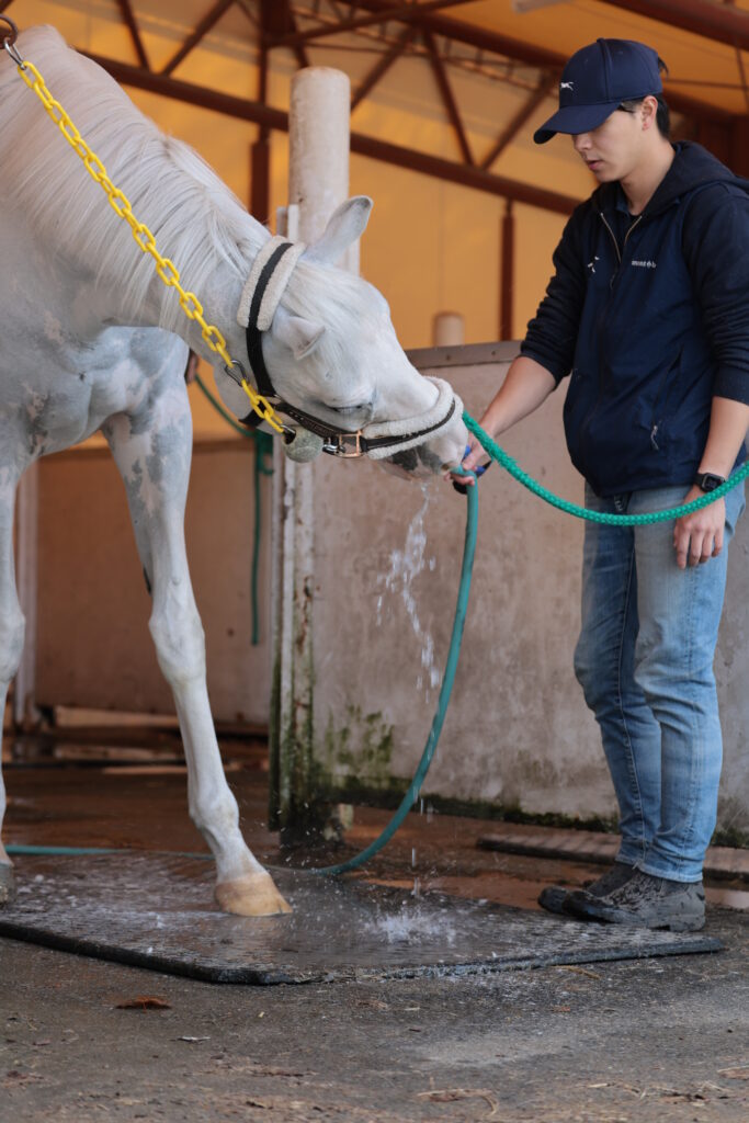 すでに綺麗になった後で厩務員さんからお水を貰っていました
