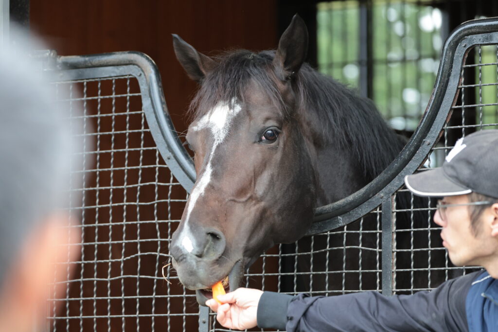 厩舎内には姿がありませんでしたが外に出ると人だかりが…